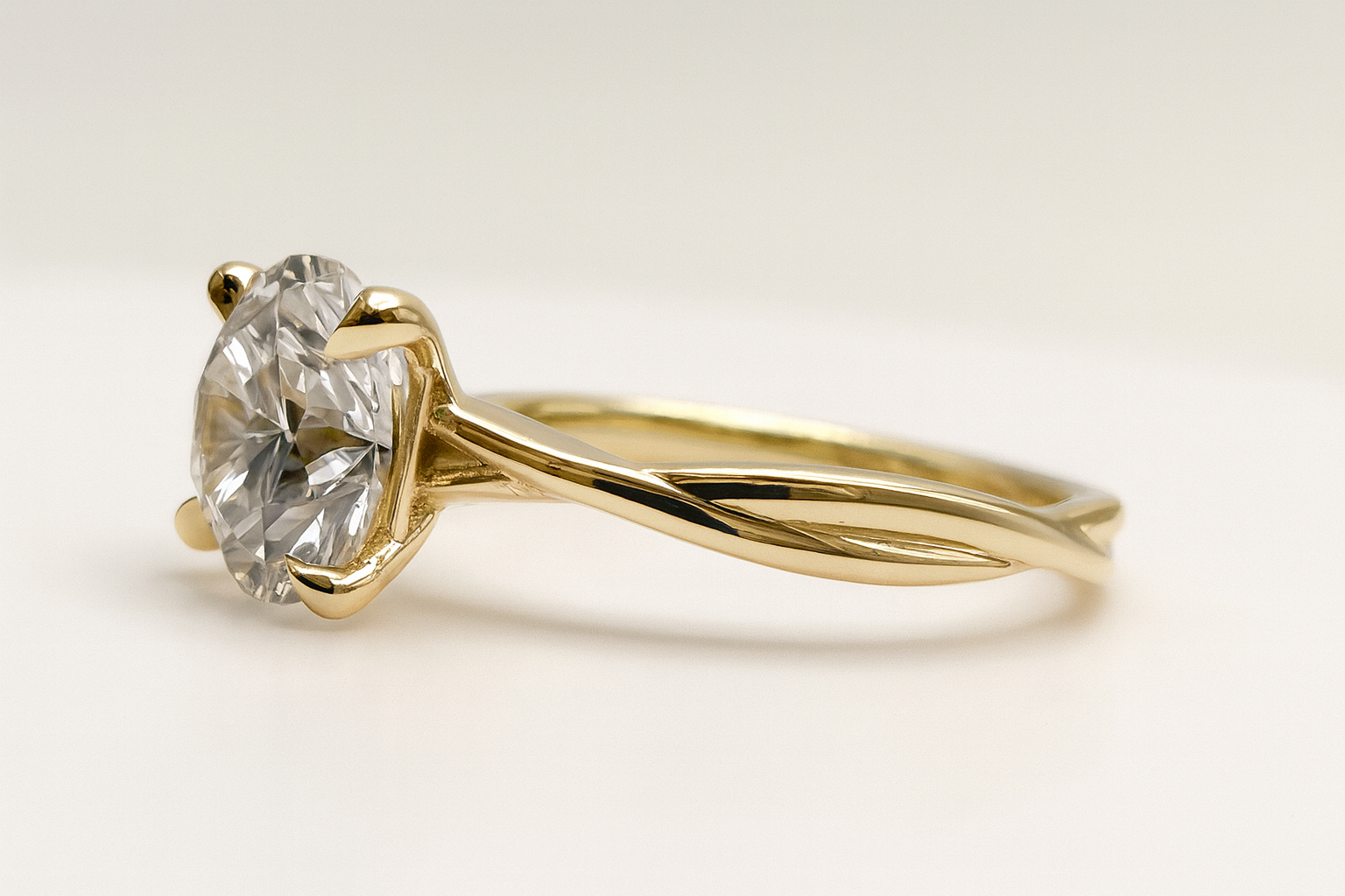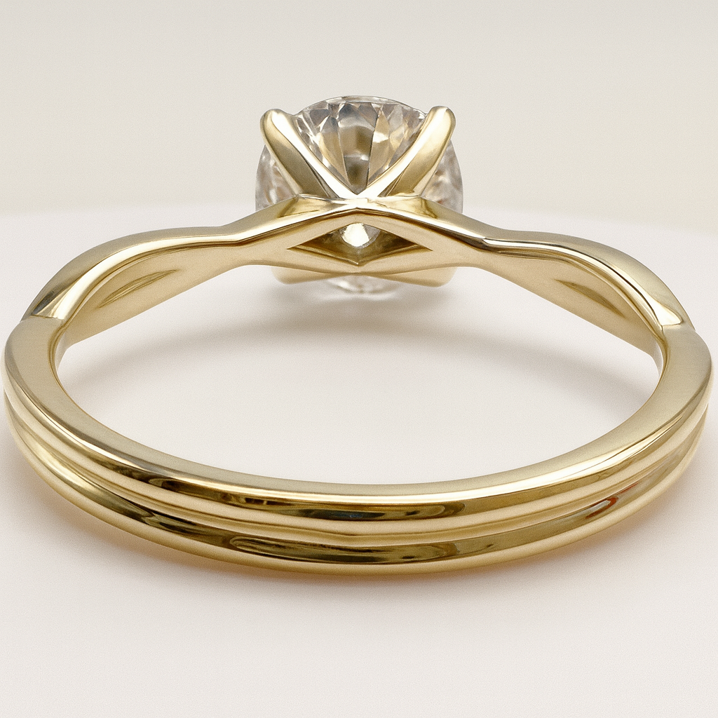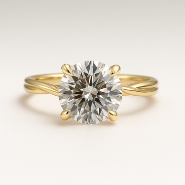 Ready to wear - Four claw set in 14k yellow gold with a classic hint of style featuring a twisted band, 1.25ct D/VS1 Lab Diamond. Size O1/2.